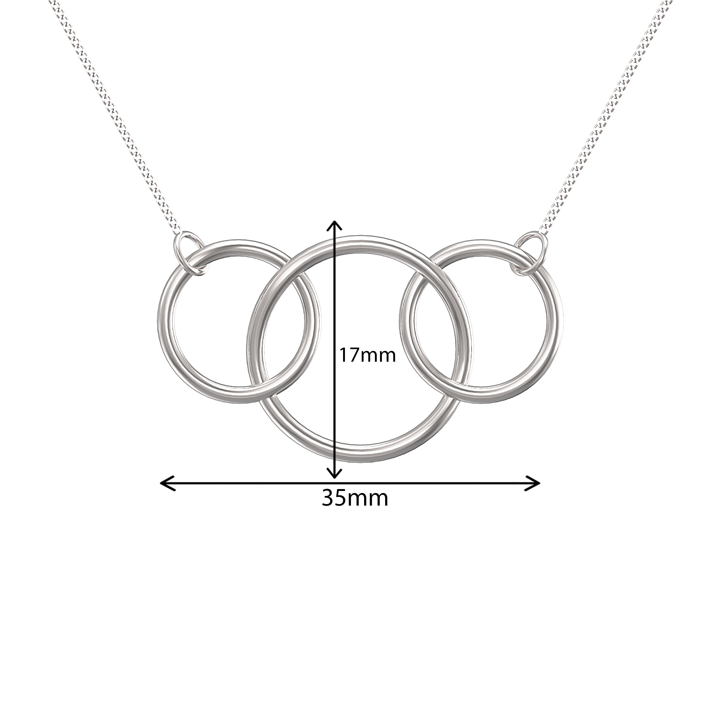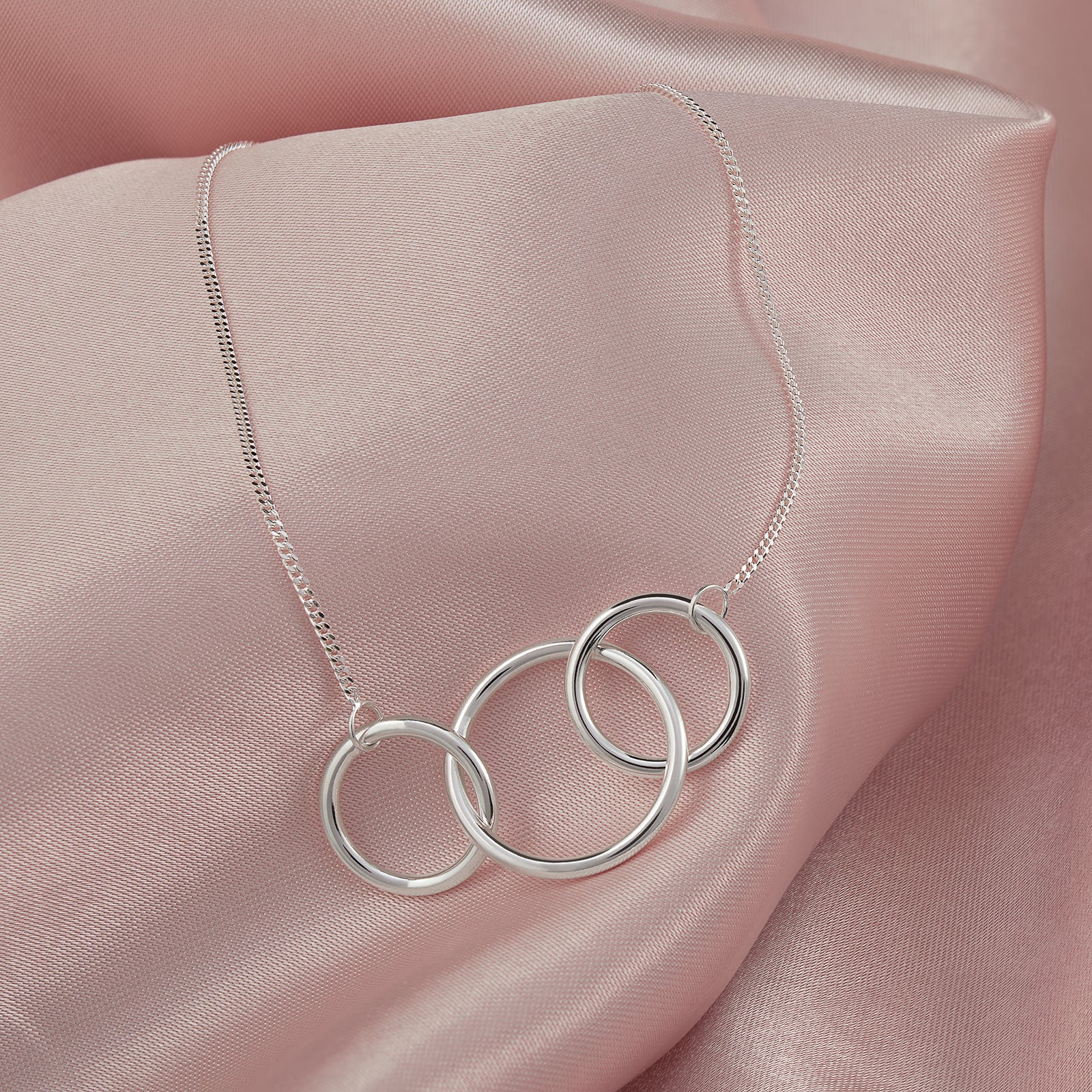 A stunning sterling silver necklace featuring three solid rings symbolising each decade of life. Adjustable to 16 or 18 inches, with rings measuring 13mm and 17mm.