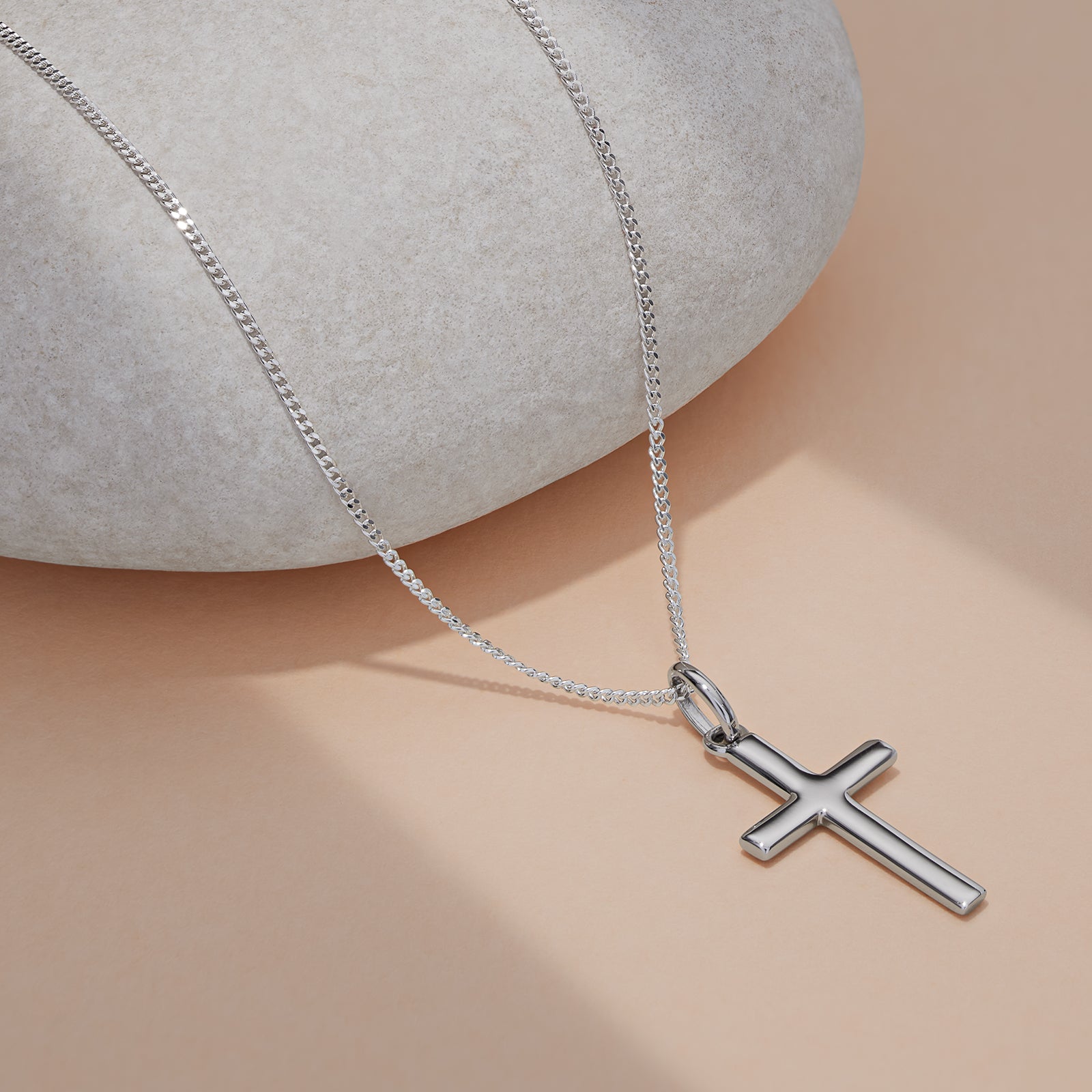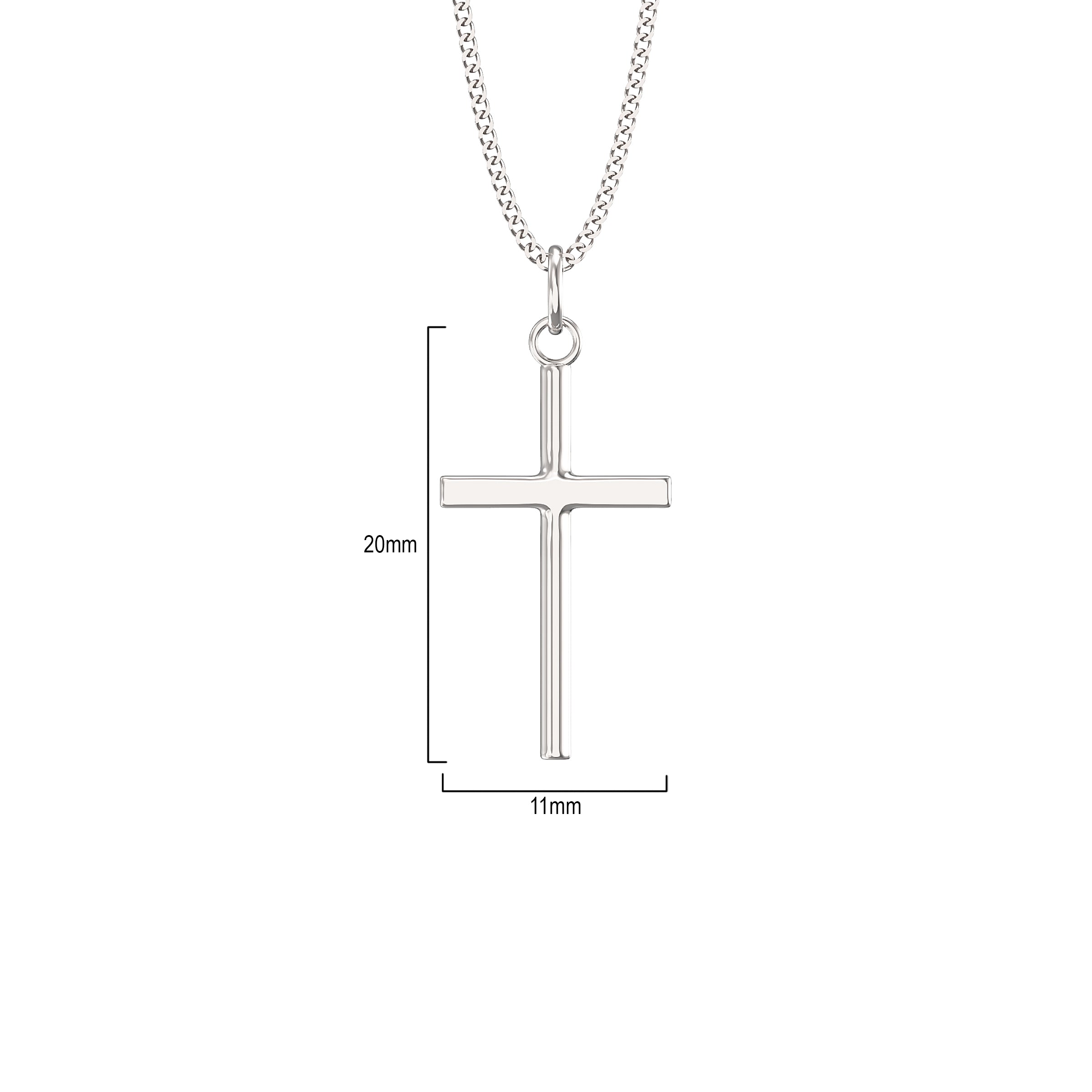 Sterling silver plain cross necklace measuring 21mm high and 11mm wide.