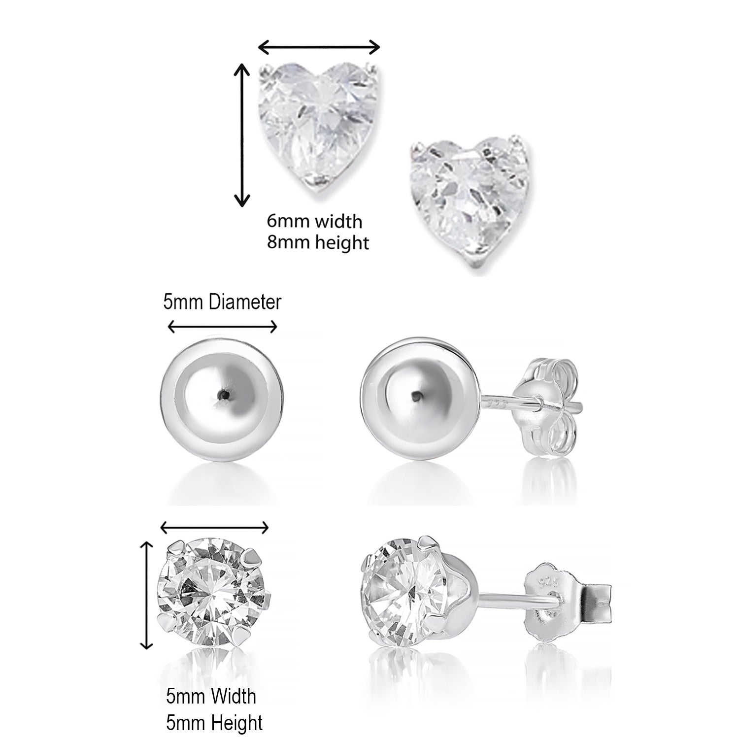 925 sterling silver stud earrings, long-lasting amazing design durable look fabulous shinning set of 3 pairs, heart stud earrings, crystal stud earrings, and ball stud earrings
