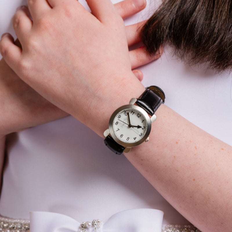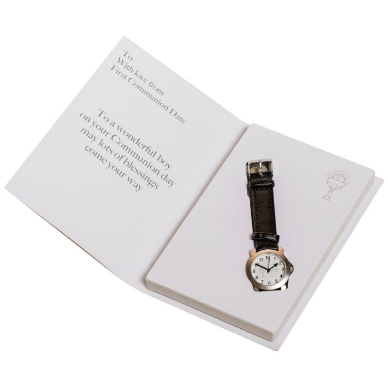 The watch fastens with a buckle with adjustable lengths, it has a black PU strap with silver casing and the watch face is inscribed with a chalice logo and the wording "First Holy Communion"
