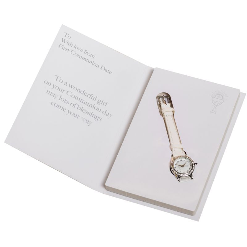The watch fastens with a buckle with adjustable lengths, it has a white PU strap with silver casing encrusted with a ring of white cubic zirconia stones and the watch face is inscribed with a chalice logo and the wording "First Holy Communion"